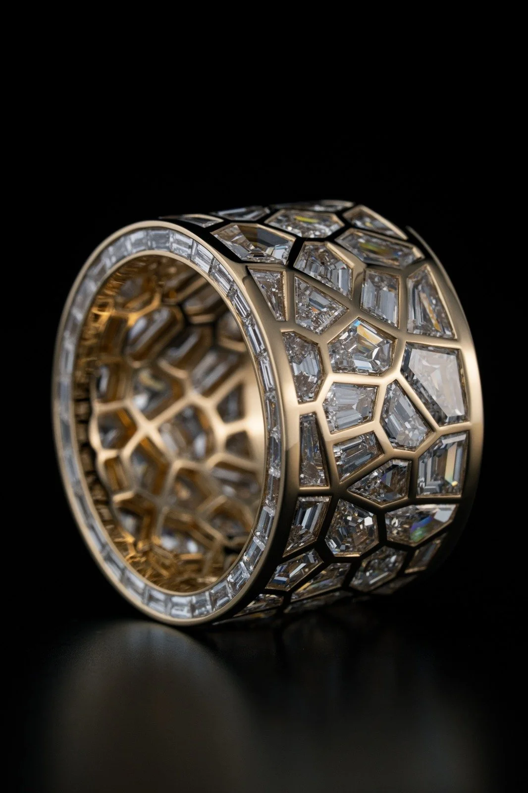 The Broken Mirror Collection pushes the boundaries of fine jewelry design. Each diamond is cut and positioned individually, forming a pattern that looks shattered — yet impossibly precise. This technique creates a surface that catches and explodes light from every angle, making the piece feel alive on the hand.